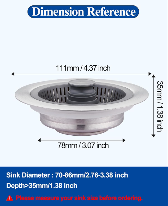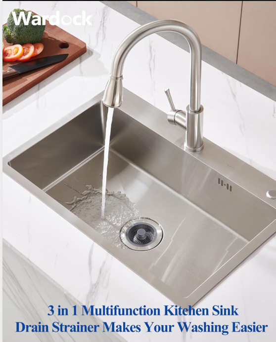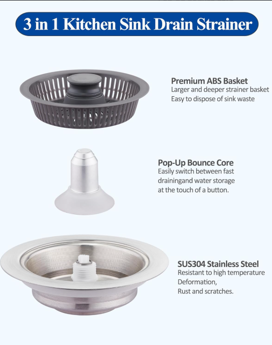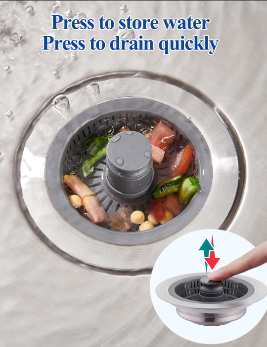 This 3-in-1 pop-up drain plug combines strainer, stopper, and anti-clog functions—perfect for kitchen sinks. It catches food scraps to prevent drain blockages, seals water for soaking dishes, and pops up easily for draining. No tools needed for installation; just rinse with water to clean, saving time on kitchen upkeep.